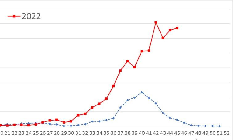 Số ca mắc, nghi mắc sốt xuất huyết theo tuần năm 2021, 2022 tại Hà Nội. (Nguồn: CDC HN)