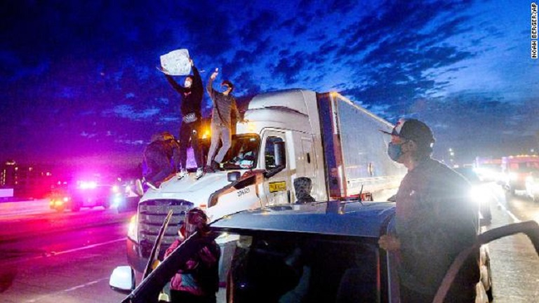 Khoảng 21h, cảnh sát phải dùng tới hơi cay để giải tán đám đông tập trung ở đường Broadway và đường số 7 khi một nhóm biểu tình đốt pháo vào ném chai lọ vào lực lượng chức năng.