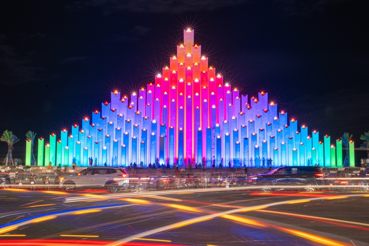 Ban đêm, tháp như “khoác” lên mình chiếc áo ánh sáng đa sắc của hệ thống LED được lập trình theo từng lớp cột. Các trụ cao thấp đan xen tạo chiều sâu thị giác, biến toàn bộ khu vực thành sân khấu nghệ thuật ánh sáng giữa biển trời Vũng Tàu, cảm giác vừa hiện đại, vừa huyền ảo.