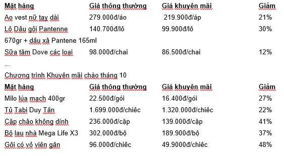 Từ 06/10 đến 19/10/2015, Hệ thống siêu thị Big C cũng triển khai chương trình khuyến mãi mới áp dụng cho hơn 1.000 mặt hàng tiêu dùng thiết yếu từ thực phẩm tươi sống, chế biến sẵn, thực phẩm khô cho đến đồ dùng gia đình, điện gia dụng, các mặt hàng văn phòng phẩm, các sản phẩm chăm sóc giấc ngủ ngon với mức giảm giá sâu từ 5-49% giúp chị em phụ nữ mua sắm tiết kiệm trong tháng mới.