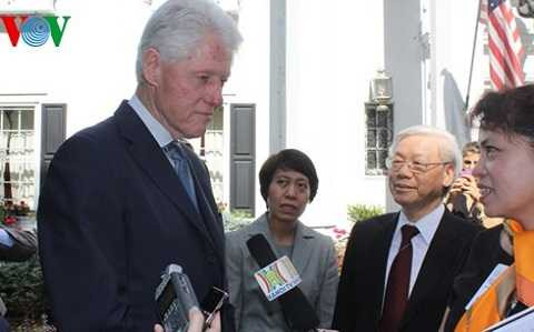 Sau cuộc gặp gỡ thân tình với Tổng Bí thư Nguyễn Phú Trọng, cựu Tổng thống Bill Clinton dành cho nhóm báo chí tháp tùng Đoàn cuộc trả lời phỏng vấn về sự kiện đặc biệt trong quan hệ Việt Nam - Hoa Kỳ này, cũng như đánh giá của ông về chuyến thăm chính thức Hoa Kỳ lần đầu tiên của Tổng bí thư Đảng Cộng sản Việt Nam.