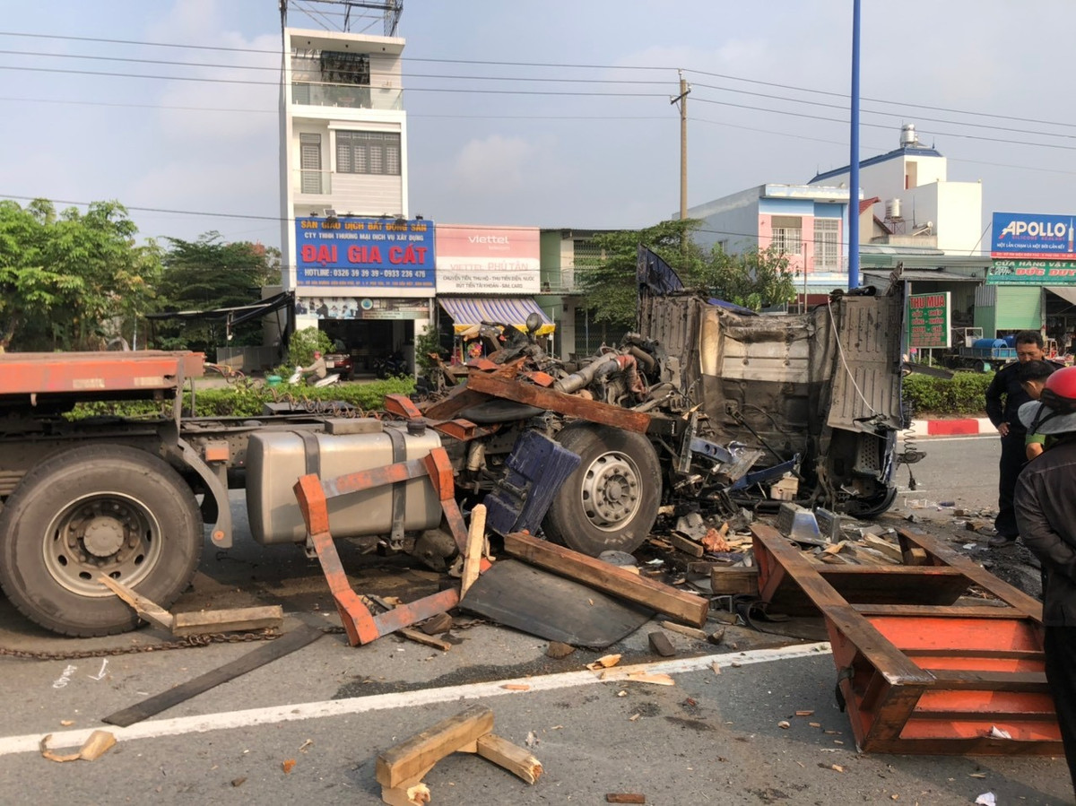 Khi đến giao lộ N3 (TP Thủ Dầu Một) thì một chiếc xe ben chạy phía trước phanh gấp, nên tài xế xe đầu kéo cũng đạp phanh.