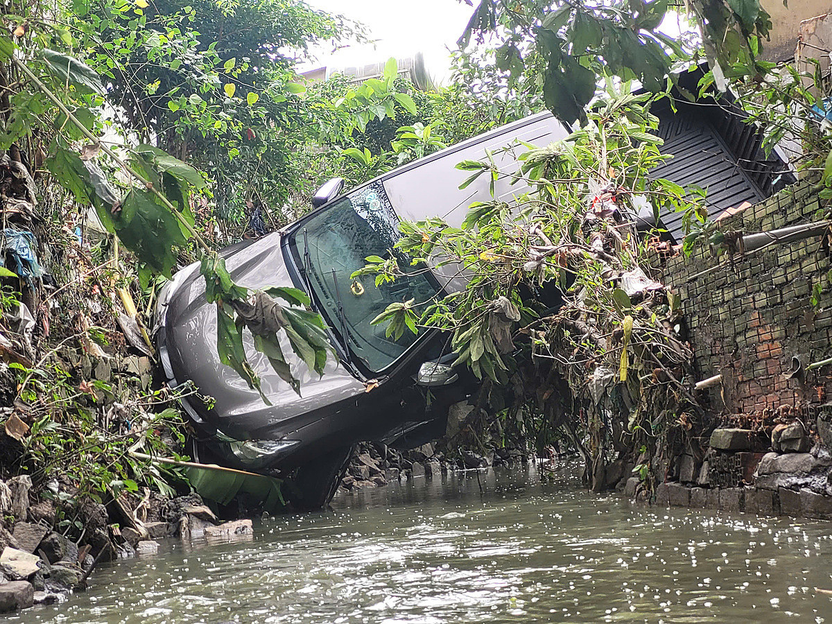 Chiếc xe bị cuốn trôi khoảng 200m rồi lật xuống mương nước.