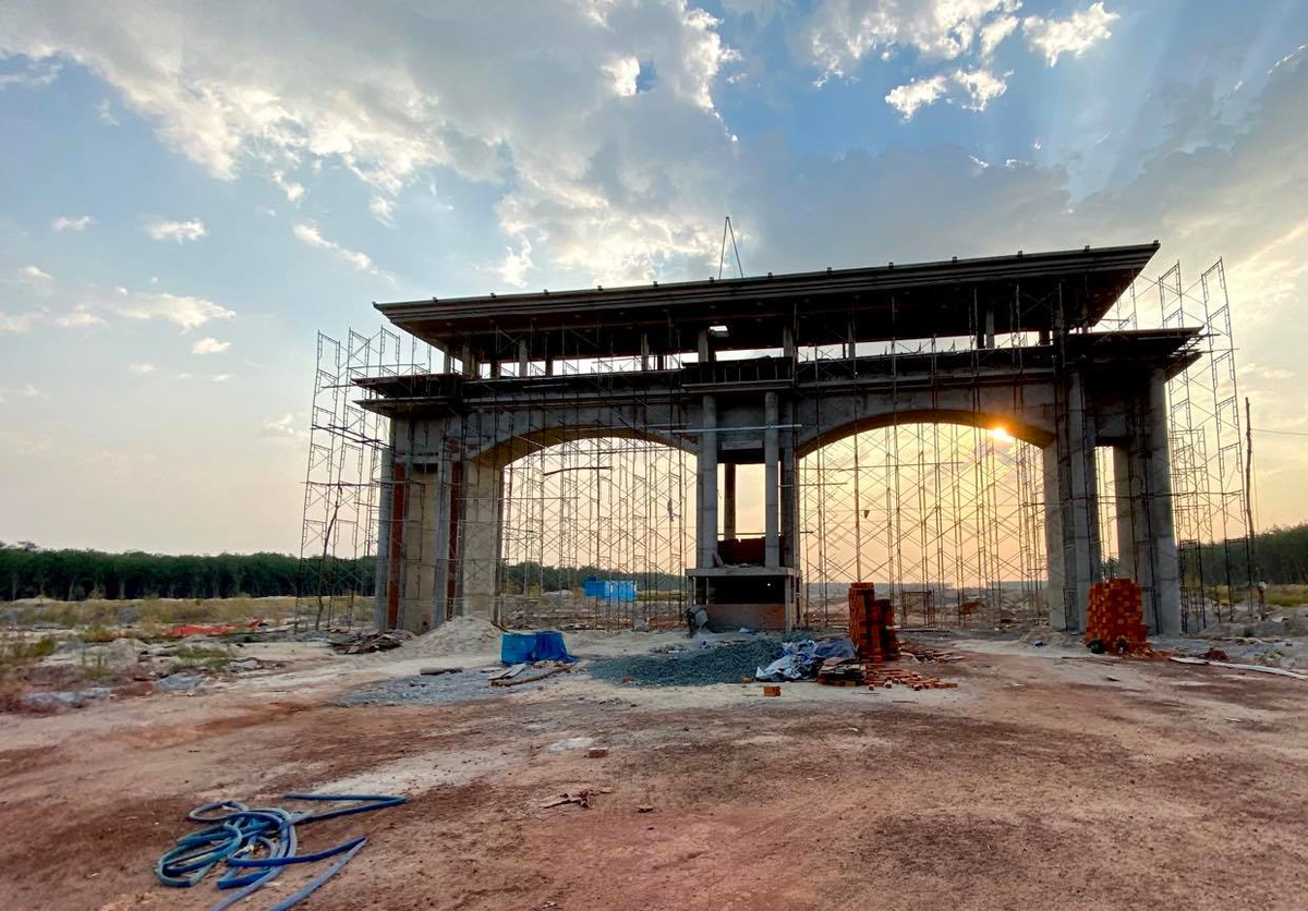 Ghi nhận thực tế của PV VTC News, dù chưa được cấp giấy phép xây dựng nhưng dự án đã thi công gần xong phần cổng đồ sộ, các tuyến đường nội khu đã hình thành, xung quanh được quây tôn kỹ lưỡng. Đáng nói, quanh khu vực dự án vẫn là những cánh đồng cao su bạt ngàn, heo hút, không có bóng người.
