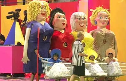 VĐV nam sẽ cải trang thành những người phụ nữ rất to lớn và đẩy thêm 1 chiếc xe nôi trong đó có 1 em bé (do VĐV nữ cải trang).