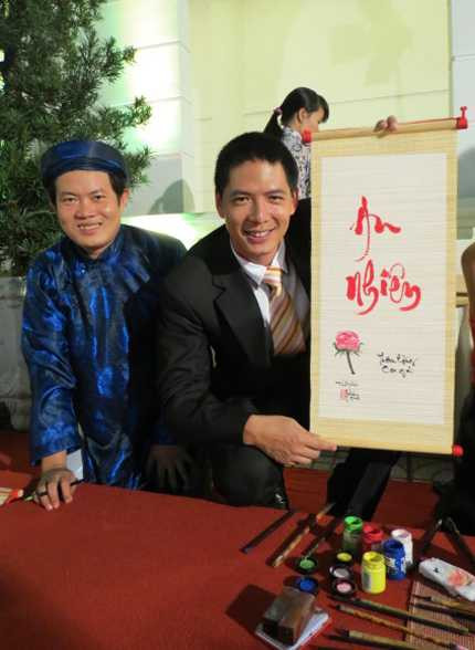 (VTC News) – Sau khi hoàn thành tốt vai trò MC trong chương trình Hội xuân Nghệ sỹ 2012 tối qua (11/1) tại TP HCM, Bình Minh tranh thủ học gói bánh tét và viết thư pháp.