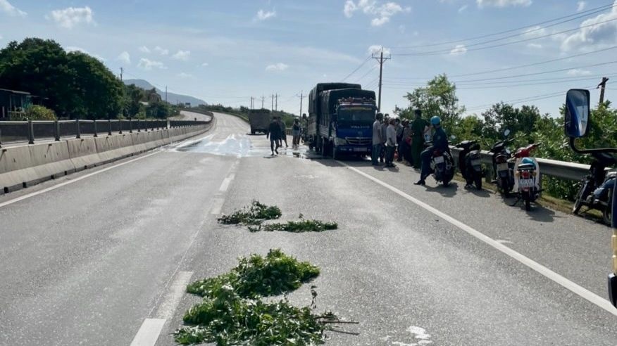 Thời điểm này, xe tải BKS 85H-001.07 bị nổ lốp nên 2 người trên xe là N.T.T (SN 1991, ngụ tỉnh Ninh Thuận) và T.N.T tấp vào lề để tiến hành thay lốp. Khi đang thay lốp thì bị xe tải mang BKS 14C-213.57 đi cùng chiều phía sau tông vào đuôi xe.