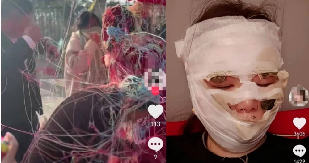 Đám cưới là sự kiện hân hoan nhất, nơi cô dâu trở thành tâm điểm chú ý bởi sự xinh đẹp, lộng lẫy nhưng không ngờ lại là bi kịch đối với cặp vợ chồng trẻ ở Thái Châu, Chiết Giang, Trung Quốc. Cô dâu bị bỏng không nhẹ khi được người thân, bạn bè chào mừng bằng việc xịt dây ruy băng nhiều màu lên mặt, lên người. Kết quả là toàn bộ khuôn mặt của cô bị bao phủ bởi những mụn nước lớn và gần như bị biến dạng.