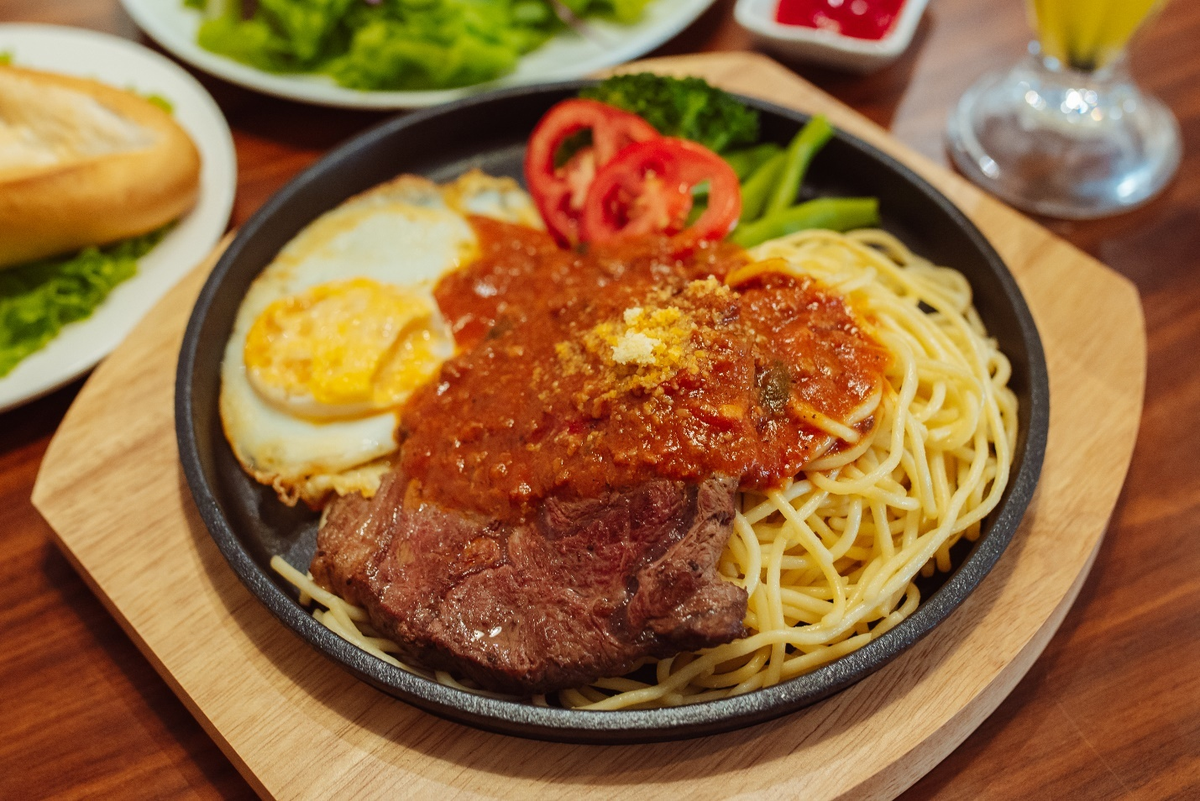 Bít tết (Beefsteak) ở đây được đánh giá là mềm, ngọt và độ chín tới theo đúng yêu cầu của các thực khách. Ngoài thịt bò, các thực khách có thể thử món mỳ Ý cũng có vị rất ấn tượng. Mỳ Ý với sợi dai mềm, kết hợp với bò bít tết là 1 sự lựa chọn hoàn hảo cho bữa tối ấm cúng hoặc lãng mạn của các gia đình, cặp đôi.
