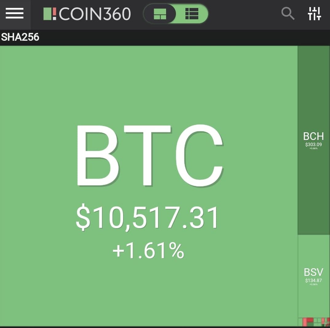 Trái ngược với màu đỏ bao trùm hôm qua, hôm nay (8/9), toàn cảnh Bitcoin lại có màu xanh với các mức tăng trưởng nhẹ. Giá Bitcoin hôm nay, 8/9, theo ghi nhận vào lúc 7h46 phút, giá Bitcoin đạt mức 10,508, tăng 1,52% so với 24 giờ trước đó.