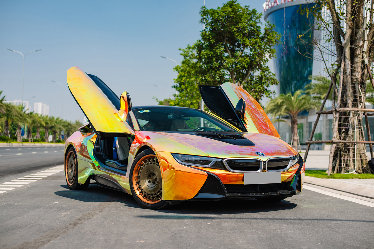 BMW i8 có màu sắc đặc trưng là màu trắng Crystal Pearl Metallic, tuy nhiên đã được chủ nhân thay đổi ngoại hình thông qua phương pháp dán decal mà không ảnh hưởng tới lớp sơn. Với lớp decal này, xe trở nên rực rỡ khi ra ánh sáng tự nhiên. Không những vậy, lớp decal này còn có thể đổi màu dưới góc nhìn khác nhau.