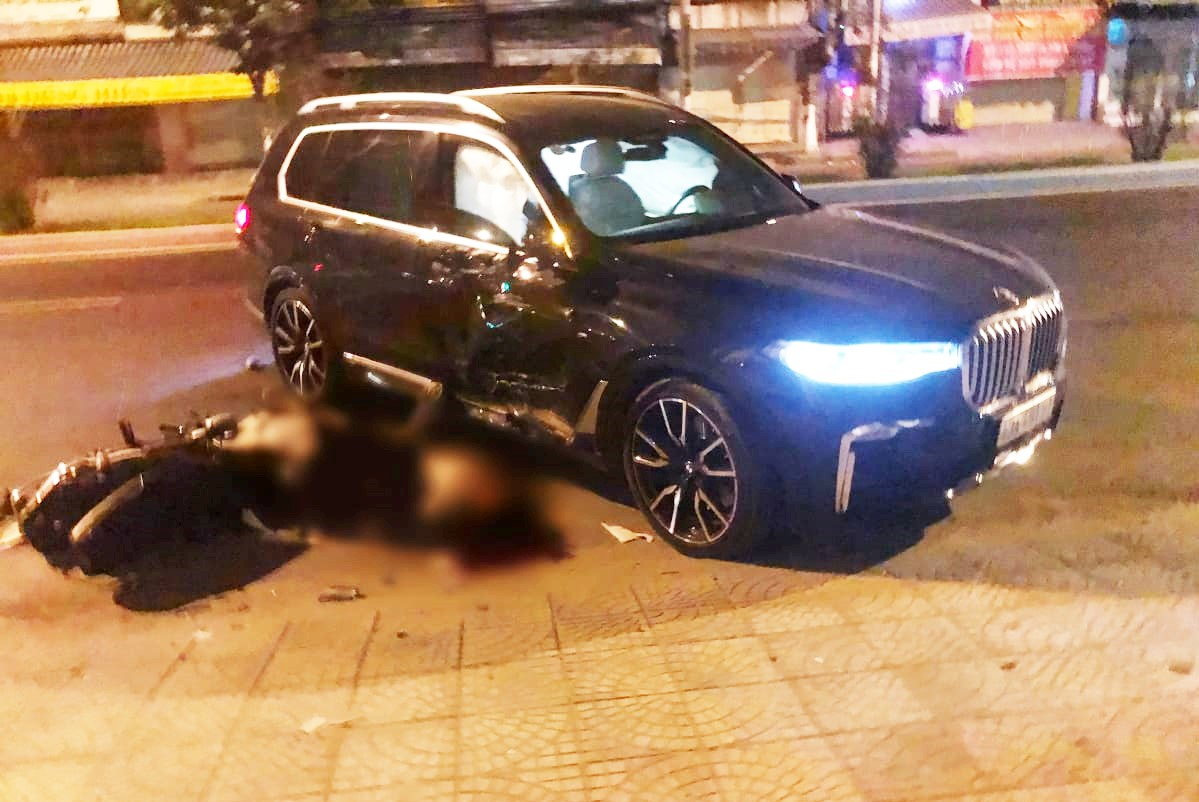Cú va chạm mạnh khiến anh L.V.D chết tại chỗ, xe máy hư hỏng nặng, ô tô BMW X7 bị móp méo cửa trước, vỡ đèn.