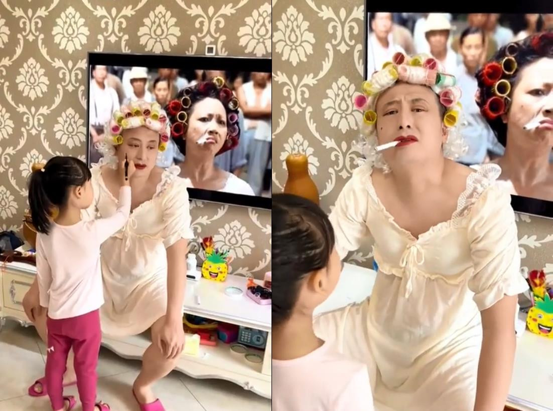 Để chiều lòng con gái, người bố chấp nhận mặc váy, bất lực ngồi yên để cho cô bé thoải mái thể hiện tay nghề hóa trang.