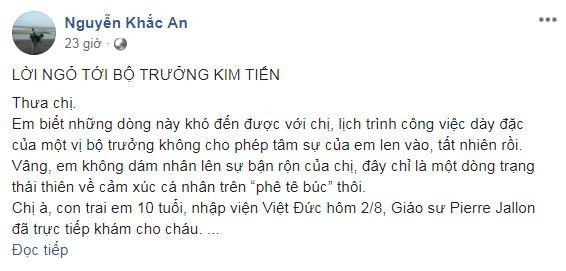 Tôi biết những dòng này khó đến được với Bộ trưởng, lịch trình công việc dày đặc của một vị Bộ trưởng không cho phép tâm sự của tôi len vào, tất nhiên rồi. Vâng, tôi không dám nhân lên sự bận rộn của Bộ trưởng, đây chỉ là một dòng trạng thái thiên về cảm xúc cá nhân trên facebook thôi.