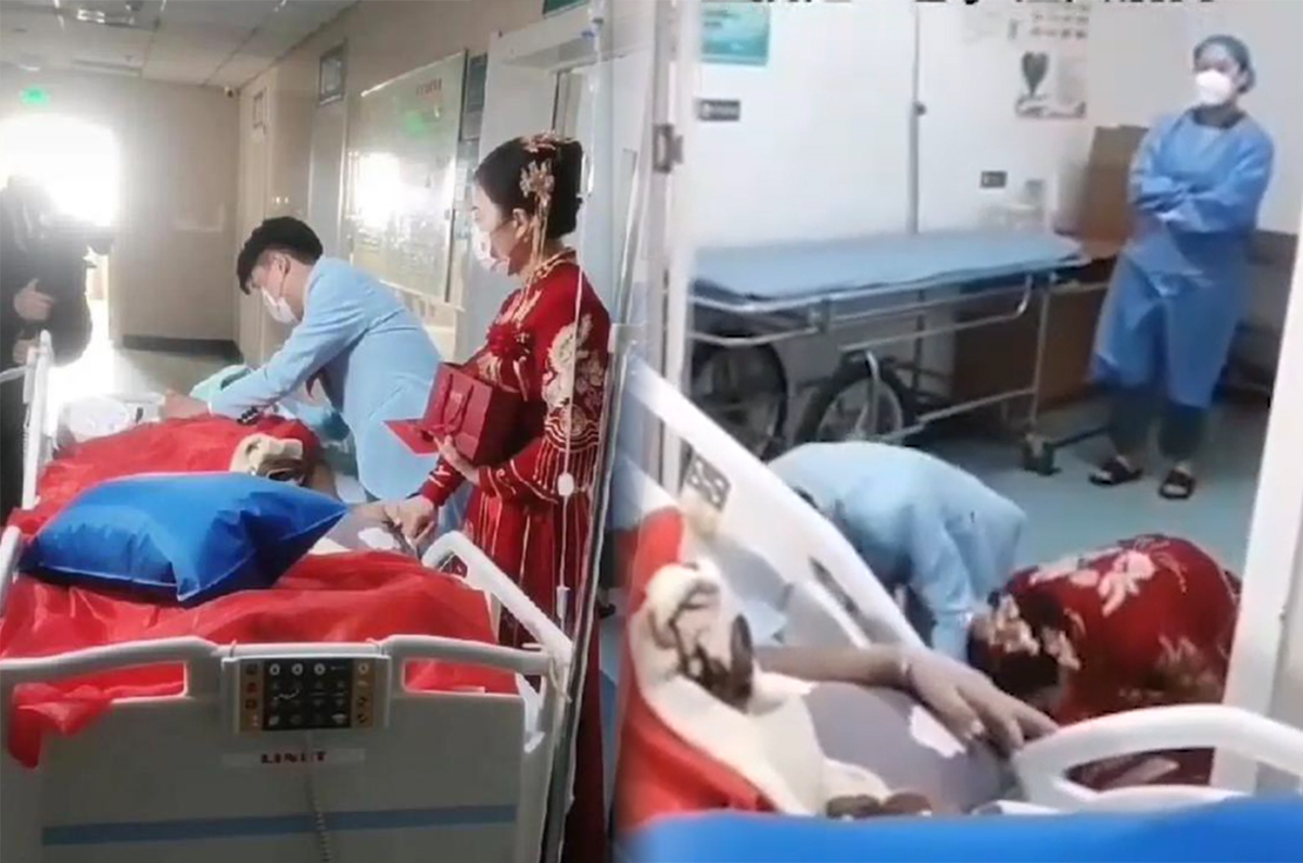 Một đoạn video ghi lại cảnh tượng xúc động tại hành lang khoa hồi sức tích cực của một bệnh viện đã khiến không ít người rưng rưng. Hình ảnh cho thấy một số nhân viên y tế đã đẩy một chiếc giường bệnh ra hành lang, đứng gần đó là cặp đôi cô dâu chú rể trong bộ lễ phục tươm tất.
