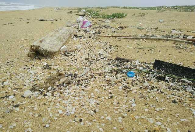 Dầu vón cục lẫn trong rác dạt vào bờ biển