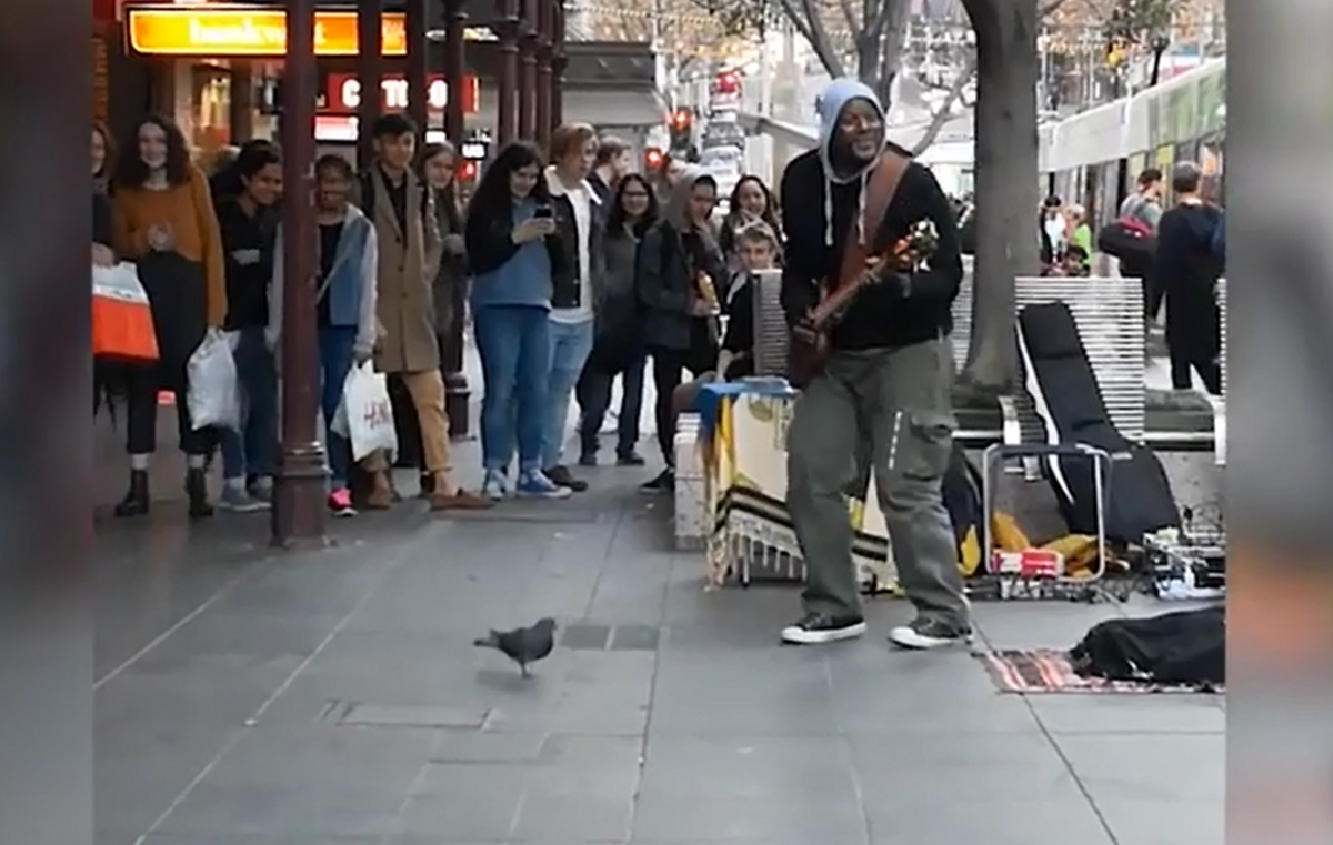 Người qua đường thích thú khi nhìn thấy chú chim bồ câu "yêu đời" nhún nhảy theo nhịp điệu ca khúc của người đàn ông hát rong.