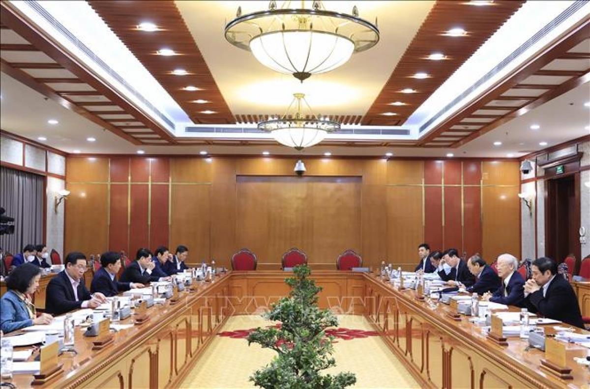 Tổng Bí thư Nguyễn Phú Trọng chủ trì họp Bộ Chính trị, sáng 11/3/2022. (Ảnh: Thống Nhất/TTXVN)