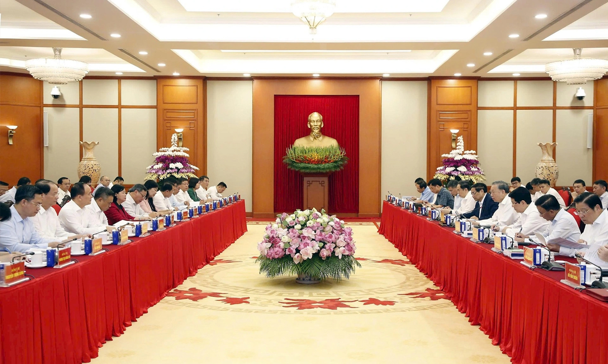 Tổng Bí thư Tô Lâm chủ trì cuộc làm việc của Bộ Chính trị với Ban Thường vụ Thành ủy Hà Nội để cho ý kiến vào dự thảo văn kiện và đề án nhân sự cấp ủy trình Đại hội đại biểu Đảng bộ thành phố nhiệm kỳ 2025-2030, hôm 21/8.