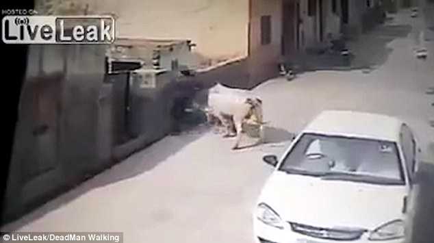 Đoạn video quay được trên đường phố Pakistan cho thấy người đàn ông đang đứng nói chuyện điện thoại cạnh tường thì bị con bò lao vào tấn công rất vô cớ.
