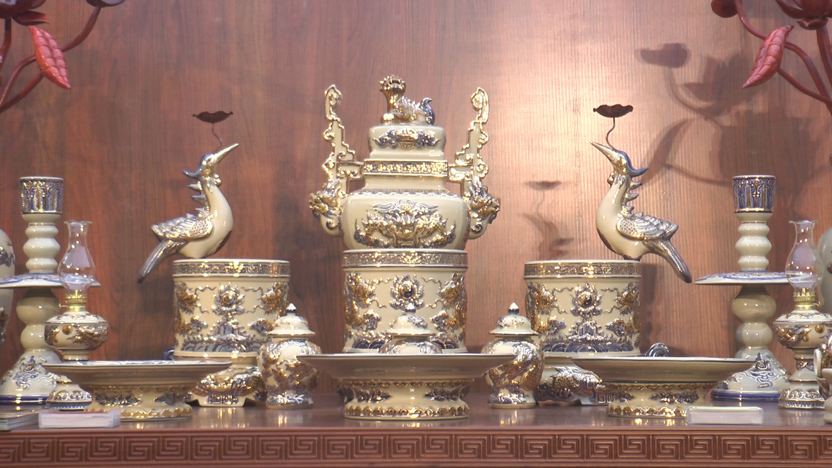 Bộ đồ thờ 18 món được các nghệ nhân Làng gốm Bát Tràng chế tác từ men cổ Hoàng tộc và vẽ vàng 24k, đang được trưng bày tại Cung văn hoá hữu nghị Việt - Xô.