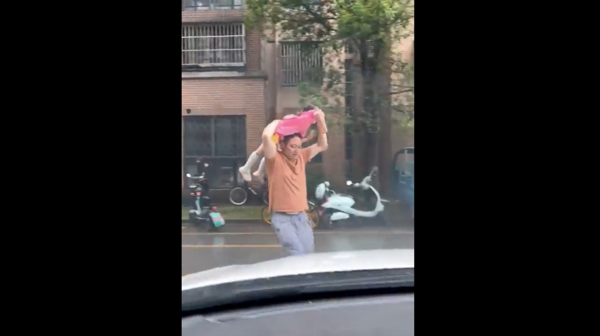Thay vì ôm con gái để tránh mưa, người bố lại bế con lên cao để che mưa cho mình.
