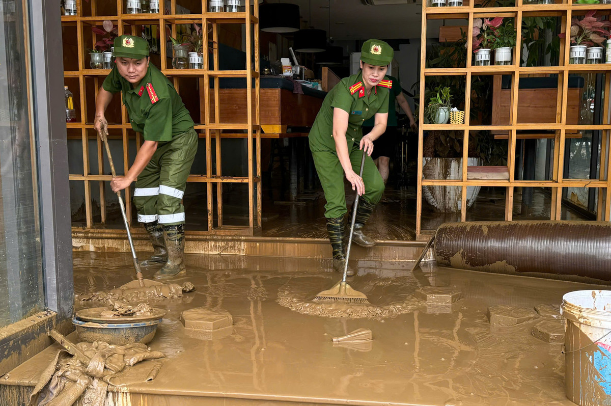 Nước rút để lại lượng bùn đất rất lớn, lực lượng chức năng được huy động để rửa bùn, đất hỗ trợ người dân.