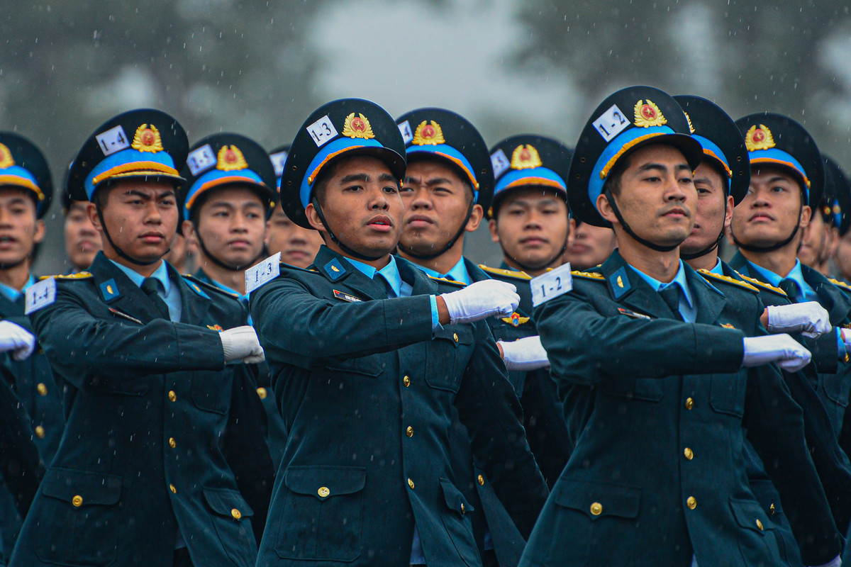 Các cán bộ chiến sĩ dầm mưa tập luyện cho Lễ diễu binh, diễu hành kỷ niệm 50 năm ngày thống nhất đất nước.