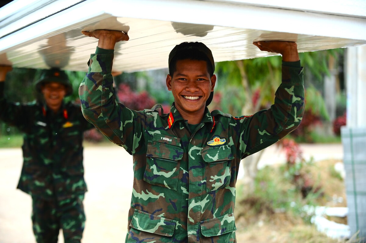 Các chiến sỹ hối hả làm việc ngày đêm giúp bà con nhanh chóng có nhà mới đón Tết Nguyên đán.