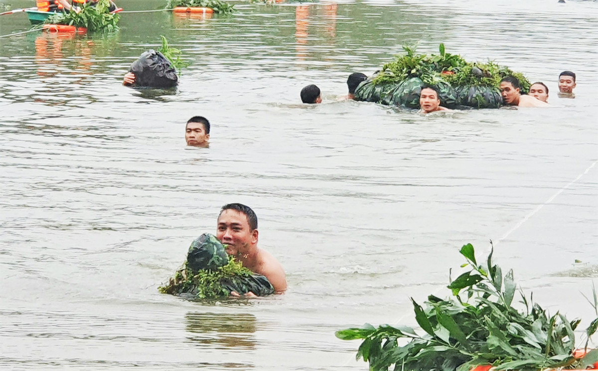 Dưới thời tiết giá rét, chiến sĩ Trung đoàn 841, Bộ CHQS tỉnh Hà Tĩnh cởi áo, mang theo 35-40kg quân tư trang vượt sông sâu gần 5m.