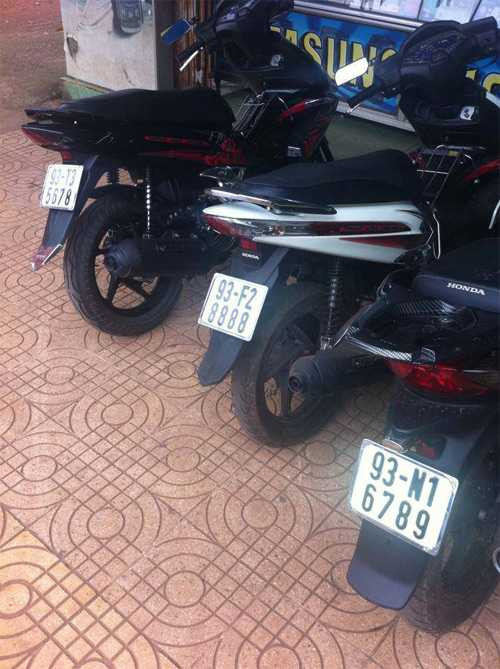 Hình ảnh ba chiếc xe tay ga biển số đẹp xếp cạnh nhau ở Bình Phước vừa được cư dân mạng chia sẻ. Trong số đó, hai chiếc Honda Air Blade bao gồm một chiếc màu trắng biển tứ quý 8 và một chiếc màu đen biển số tiến đều 5678.
