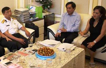 | Đại diện lãnh đạo Bộ Tư lệnh Quân chủng Hải quân (trái) trong buổi tiếp xúc vợ chồng bà Hằng để tiếp nhận tài sản ủng hộ bộ đội Trường Sa. Ảnh: Phan Cường |