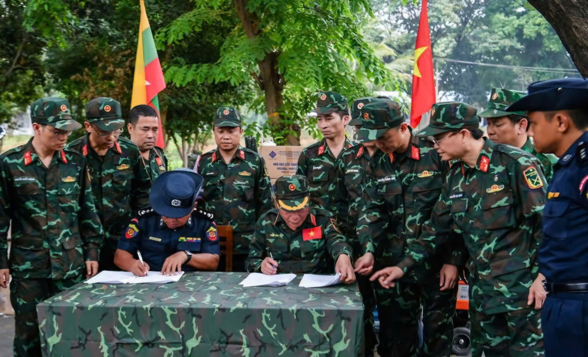 Thiếu tướng Phạm Văn Tỵ và Thiếu tướng U Myat Thu ký biên bản bàn giao số trang thiết bị, vật tư, lương thực. (Ảnh: Vũ Hùng)