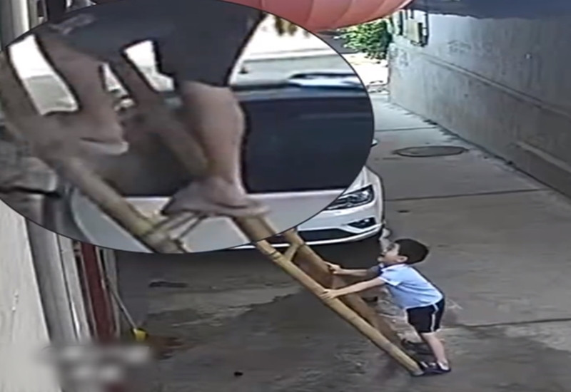 Người đàn ông họ Đỗ ở Hình Đài, Hà Bắc, Trung Quốc leo lên mái nhà để sửa tấm che nắng, nhờ con trai giữ thang cho khỏi trơn, trượt. Làm xong, anh đang leo xuống thì bất ngờ thanh tre bên trái thang bị gãy. Chiếc thang nghiêng ngả mạnh khiến người bố hụt chân, tình huống rất nguy hiểm.