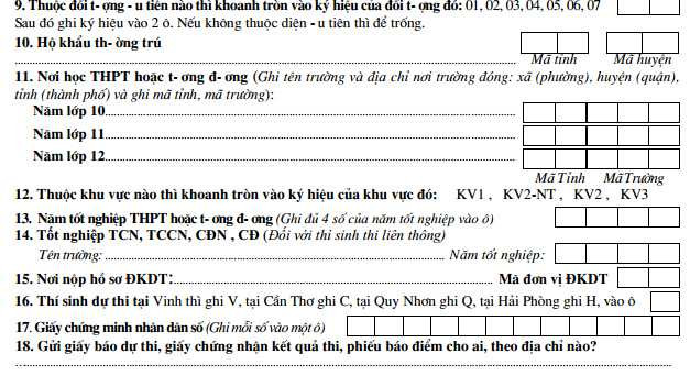 Thí sinh phải ghi đầy đủ các mục ở mặt trước túi hồ sơ và phiếu số 1, số 2 theo hướng dẫn ghi ở mặt sau phiếu số 2 rồi nộp cho nơi nhận hồ sơ kèm theo bản sao (có công chứng) các giấy chứng nhận đối tượng ưu tiên (con liệt sĩ, con thương binh...), các giấy tờ theo yêu cầu của trường tuyển sinh riêng (nếu có) và 2 ảnh cỡ 4x6 kiểu chứng minh thư mới chụp trong vòng 6 tháng (có ghi rõ họ và tên, ngày, tháng, năm sinh, tỉnh, huyện và mã số đơn vị ĐKDT vào mặt sau tấm ảnh, 2 ảnh này đựng trong một phong bì nhỏ).