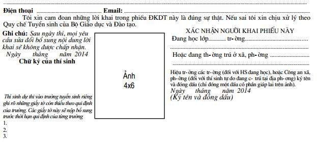 Ngoài ra phải dán thêm 1 ảnh vào mặt trước túi đựng hồ sơ. Thí sinh dự thi vào những trường tuyển sinh riêng cần ghi rõ những giấy tờ còn thiếu so với yêu cầu của trường (như học bạ, kết quả thi tốt nghiệp trung học phổ thông...) vào phần cuối của phiếu đăng ký dự thi.