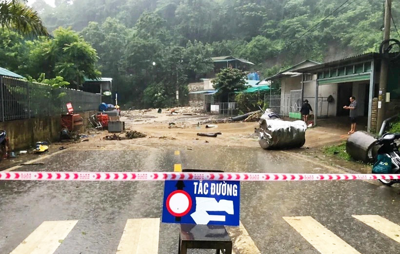 Một tuyến đường cấm phương tiện lưu thông do mưa lũ. (Ảnh: TTXVN phát)