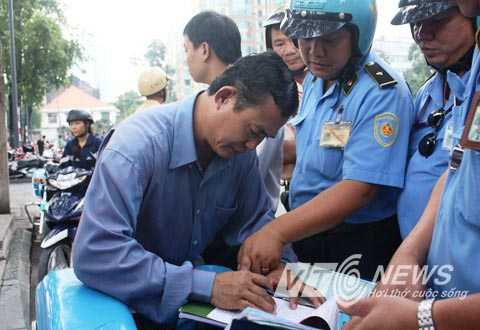 | Một tài xế taxi Uber đang ký vào văn bản xử phạt hành chính sáng 28/11 tại TP.HCM |