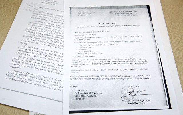 Văn bản giả mạo có số 116/2017/PĐ-BKHĐT đề ngày 16/6/2017 với nội dung Bộ KH&ĐT phúc đáp văn bản của Công ty TRIDENT CRYPTO ACADEMY tại Việt Nam về việc cho phép công ty này được kinh doanh tiền điện tử Onecoin. Văn bản giả mạo số 116/2017/PĐ-BKHĐT có hình ảnh con dấu của Cục QLĐT, chữ ký của ông Nguyễn Đăng Trương với chức danh Chủ tịch, Phó Cục trưởng Cục QLĐT