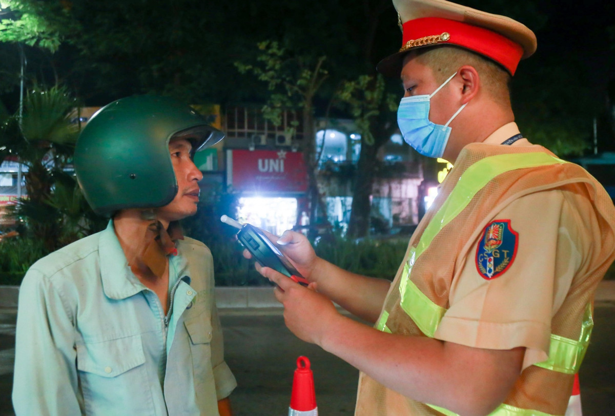 Cán bộ CSGT Công an TP Hà Nội đang kiểm tra nồng độ cồn của người tham gia giao thông.