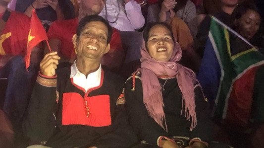 Ngồi trên khán đài để theo dõi cuộc thi, bố mẹ H'Hen Niê diện trang phục dân tộc truyền thống của dân tộc Ê-Đê và cầm lá cờ Việt Nam để cổ vũ con gái. "Cô chú rất hạnh phúc, tự hào và vui sướng. Mong cả nước cũng hạnh phúc giống như cô chú", hai người bày tỏ cảm xúc.