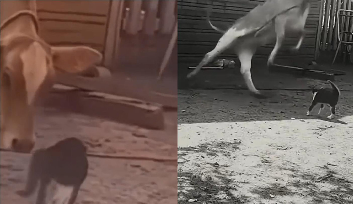Mèo vừa giơ móng vuốt doạ, bò đã giật mình bật ngửa ra phía sau.
