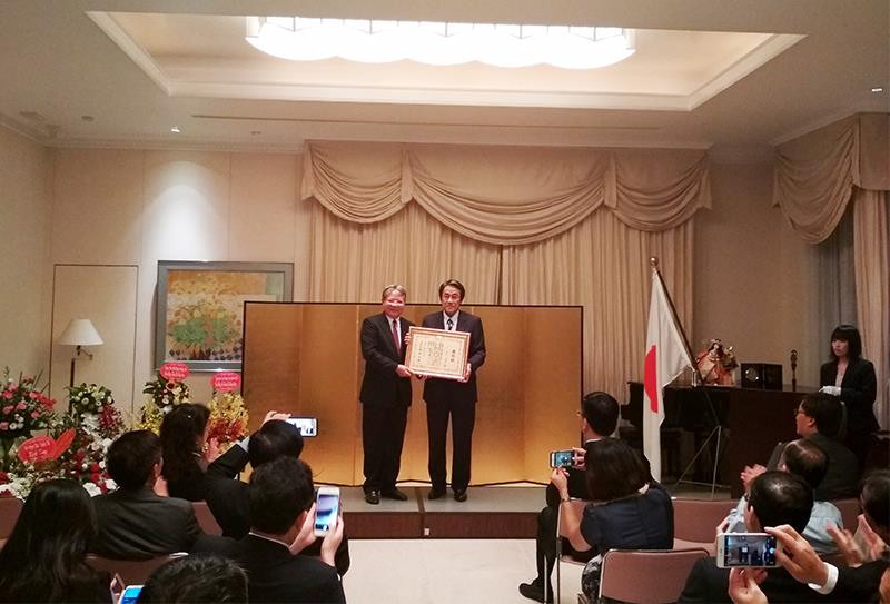 Đại sứ Nhật Bản tại Việt Nam Kuinio Umeda trao bằng khen của Bộ trưởng Ngoại giao Nhật Bản cho nguyên Bộ trưởng Tư pháp Hà Hùng Cường. (Ảnh: Lưu Thủy)