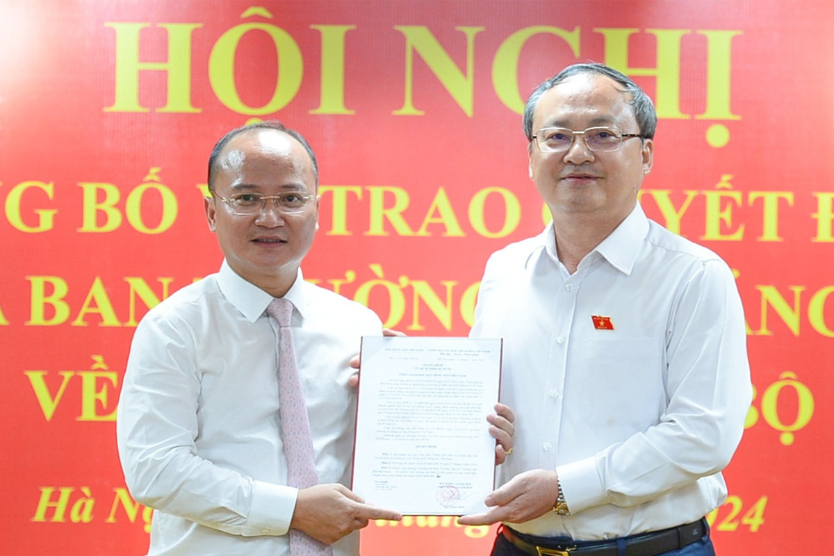 Tổng Giám đốc VOV Đỗ Tiến Sỹ trao quyết định bổ nhiệm lại Giám đốc Đài Truyền hình Kỹ thuật số VTC cho ông Trần Đức Thành.