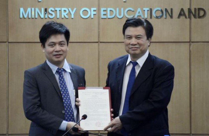 Thứ trưởng Bộ GD&ĐT Nguyễn Hữu Độ (phải) trao quyết định bổ nhiệm tân Vụ trưởng Vụ Giáo dục trung học Nguyễn Xuân Thành.