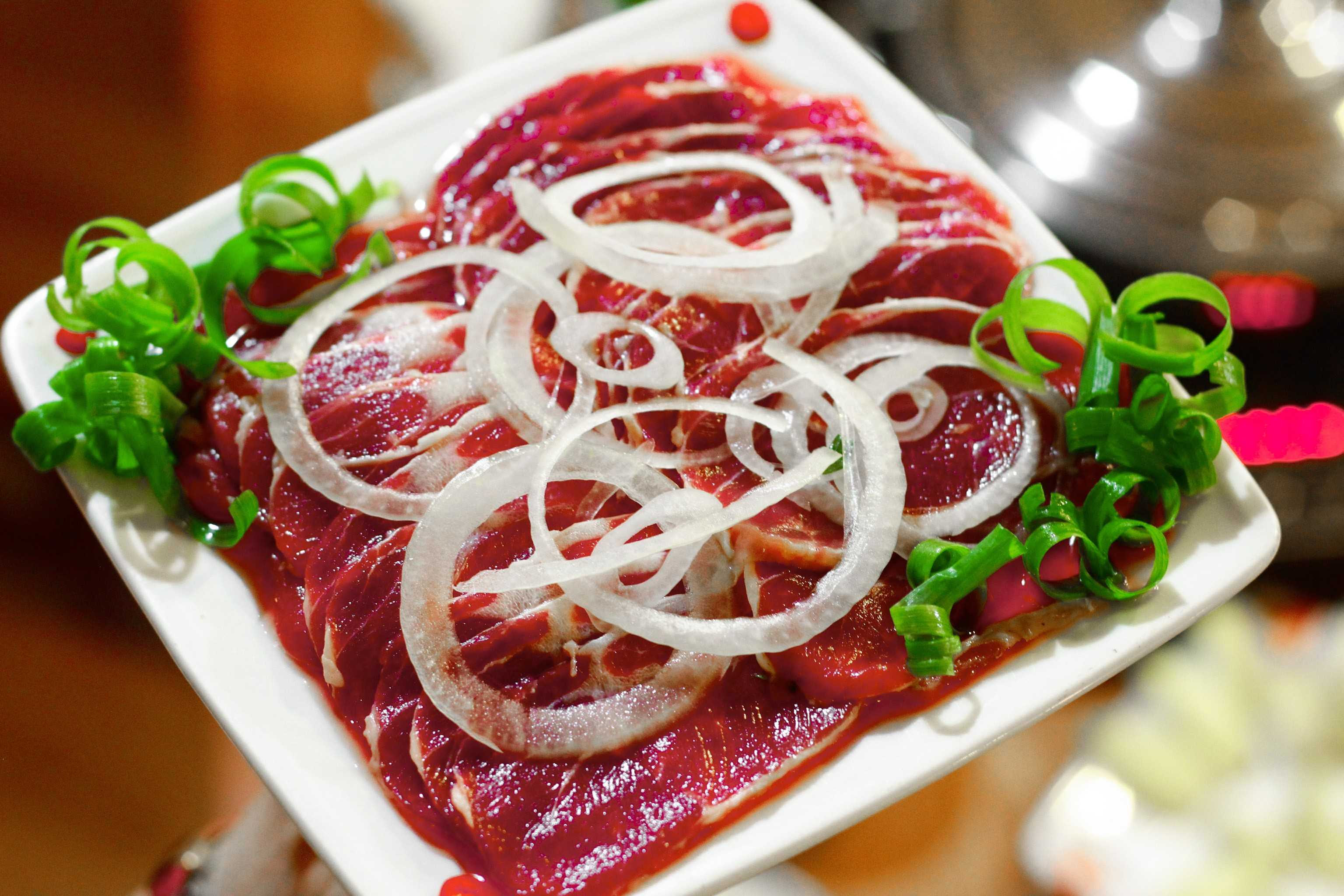 Không những thế, thịt bắp bò để nhúng lẩu là loại thịt được nhà hàng cẩn thận đặt mua từ Sơn La. Nơi cao nguyên mát mẻ là địa điểm thích hợp để những chú bò phát triển tốt nhất, cho ra những thớ thịt săn chắc, đỏ tươi. Từng đường gân trắng quyện chặt lấy từng thớ thịt đỏ trông thật ngon mắt!
