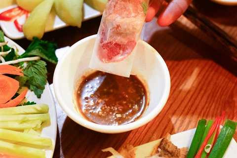 Khi thưởng thức, thực khách chỉ cần nhúng qua nước nhúng để ngấm gia vị rồi sử ăn với món cuộn. Vị béo ngậy của miếng thịt gầu lấy từ phần má bò có xen mỡ nhưng ăn giòn và không ngấy cùng vị ngọt của nước nhúng hầm từ xương làm nức lòng biết bao thực khách.