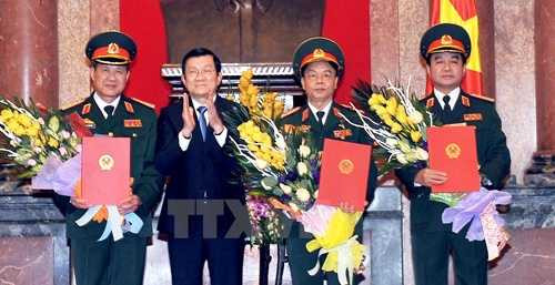 Chủ tịch nước Trương Tấn Sang vừa trao quyết định thăng hàm từ Trung tướng lên Thượng tướng đối với 2 Thứ trưởng Bộ Quốc phòng và Phó Tổng tham mưu trưởng.
