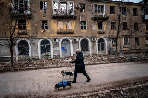 Một người dân di chuyển qua tòa nhà bị hư hại trong xung đột Nga-Ukraine tại Chasiv Yar, miền Đông Ukraine ngày 5/1/2023.