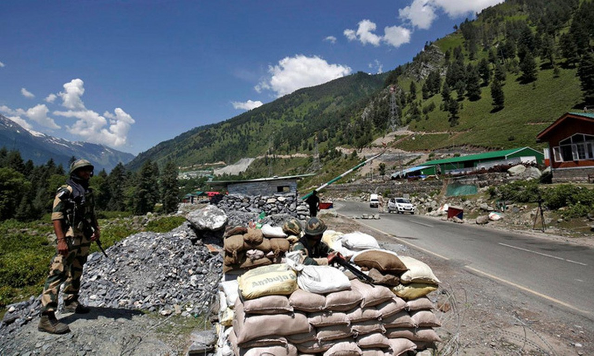 Lực lượng biên phòng Ấn Độ canh gác tại trạm kiểm soát dọc đường cao tốc tại Gagangir dẫn tới biên giới với Trung Quốc hôm 17/6. (Ảnh: Reuters)